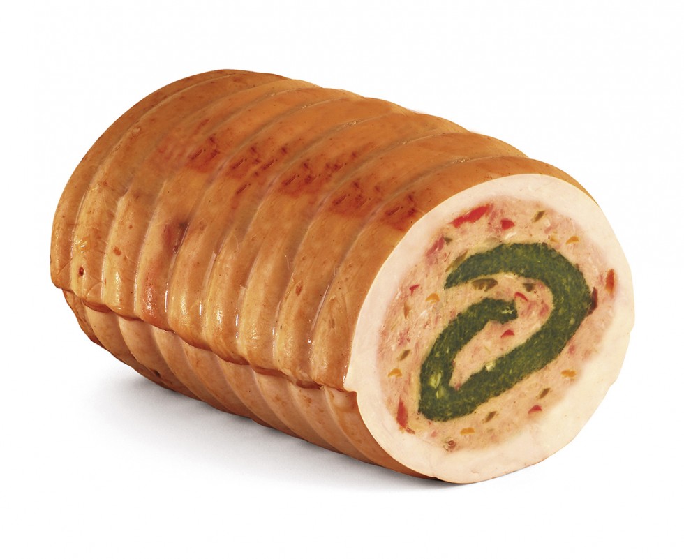 spécialité composée de noix de dinde nettoyées et farcies avec un mélange de viandes, (mélange de porc et de bœuf), assortie de légumes et d’une farce aux épinards; les deux couches intérieures sont assemblées de manière à former une spirale, roulées sur la noix de dinde et placées dans moule cylindrique, le rôti est cuit à la vapeur, refroidi, emballé sous-vide sous contrôle et pasteurisé
